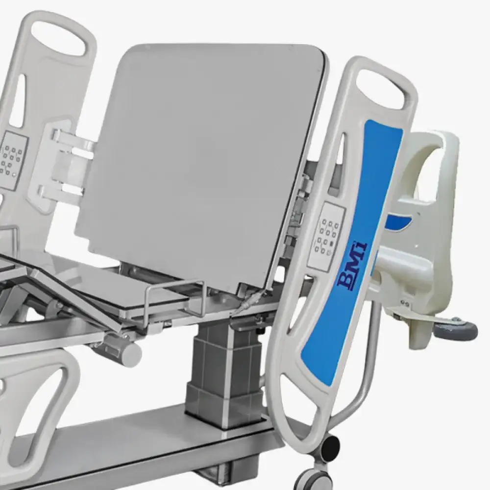 • لوح سرير مكون من 4 أقسام، مصنوع من لوح بلاستيكي مصفح بالحرارة (HPL)، وشفاف للأشعة السينية، وفتحة حامل الكاسيت، ويمكن تمديده بطول السرير