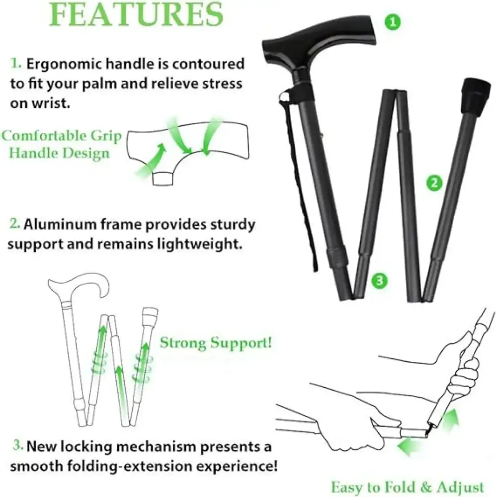 - قابل للطي: يمكن طي العكاز بسهولة لسهولة التخزين والنقل، مما يجعله مثاليًا للسفر أو الاستخدام اليومي.