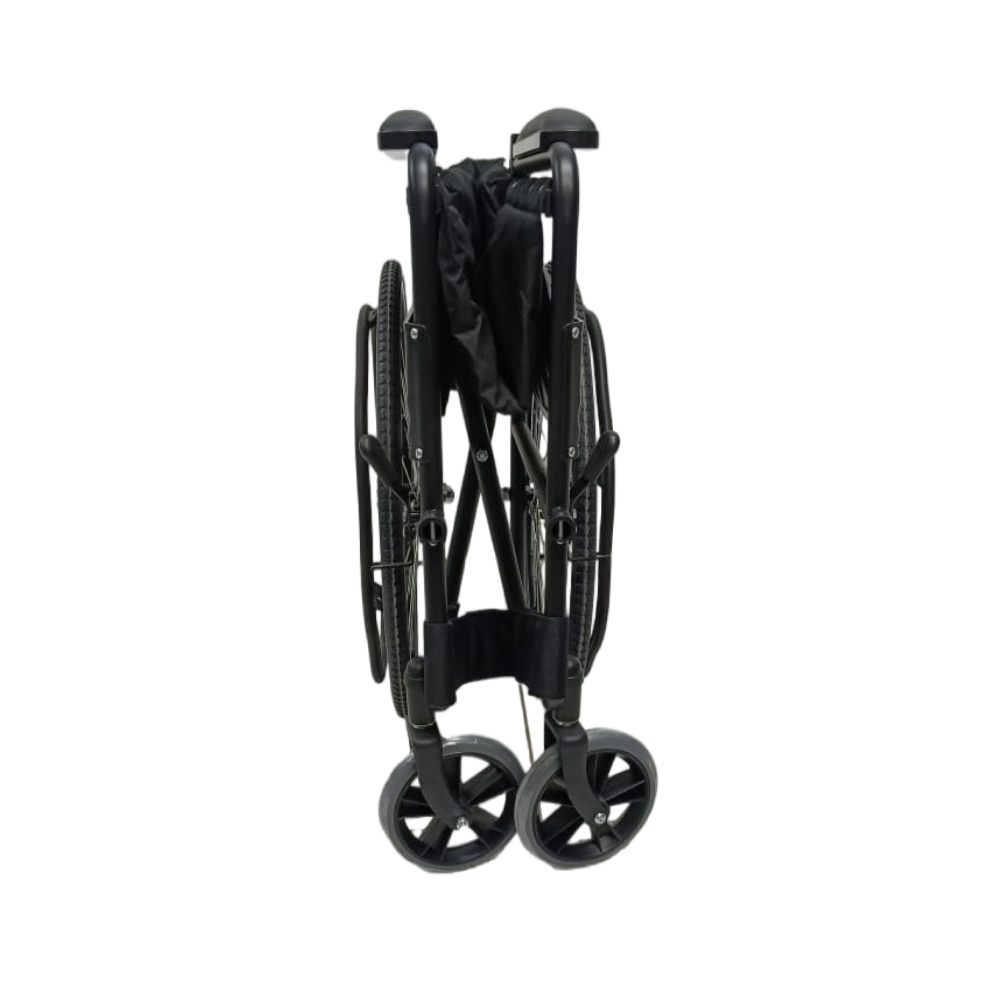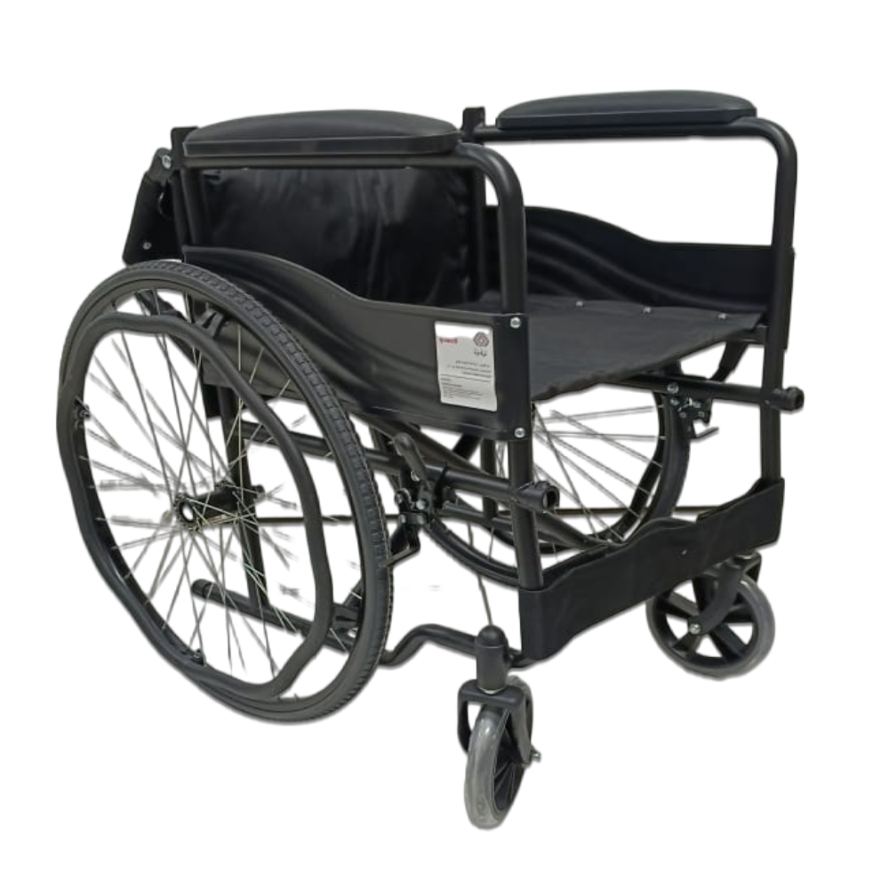 • عجلات كبيرة سهلة الدفع: عجلات خلفية كبيرة تسهل على المستخدم دفع الكرسي بنفسه أو بمساعدة مرافق.