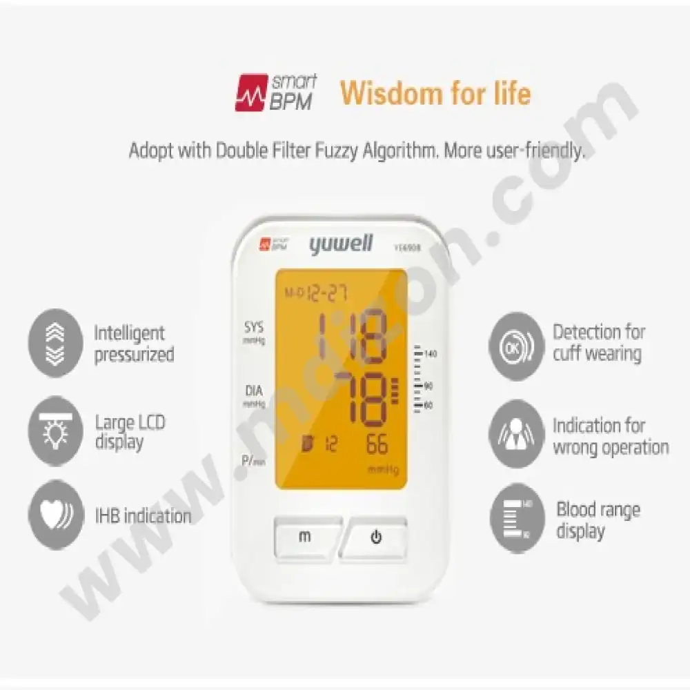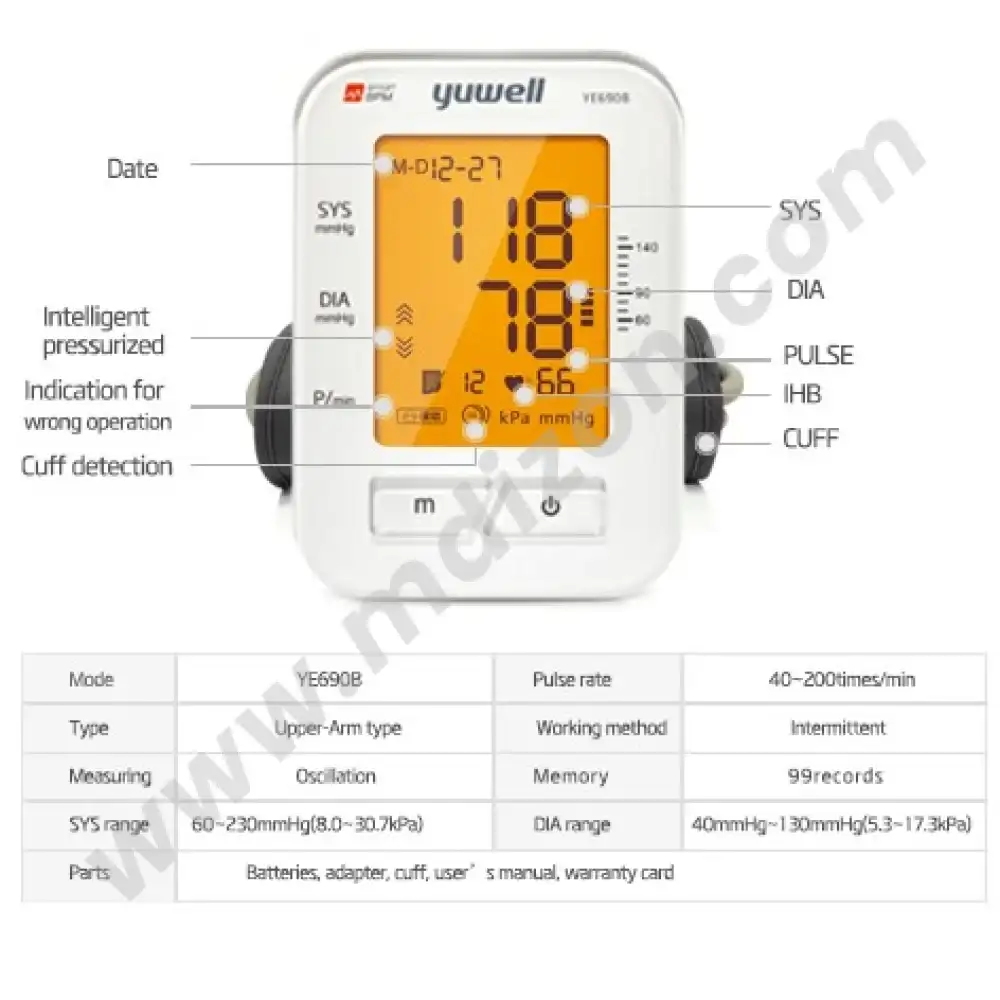 صغيرة ومدمجة وخفيفة الوزن ويسهل حملها. صوت يتحدث التايلاندية قل لي مستوى الضغط وأخبرني بالقيمة طبيعي أو غير طبيعي شاشة عرض رقمية LCD كبيرة سهل القراءة النطاق المقاس الضغط العلوي: 60-230 ملم زئبق الضغط السفلي: 40-130 مم زئبق نبض 40-200 نبضة / دقيقة الدقة الضغط ± 3 مم زئبق ، النبض ± 5٪ من القيمة المقاسة عملية أكثر ملاءمة بلمسة زر واحدة يمكن حفظ الذاكرة. 80 قيمة مع التاريخ والوقت 1 × بطاريات AA 5.4 فولت أو استخدامها مع محول التيار المتردد 220 فولت عمر خدمة الفحم يمكن قياسه حوالي 300 مرة. وزن الماكينة 267 جرام حجم الماكينة 127 × 93 × 74 مم. سيتم إيقاف تشغيل الوحدة تلقائيا. إذا لم يتم استخدامه في غضون 2 دقيقة. ماذا يوجد في الصندوق 4 بطاريات AA صفعة الذراع 22-45 سم. محول YUWELL حقيبة المعدات